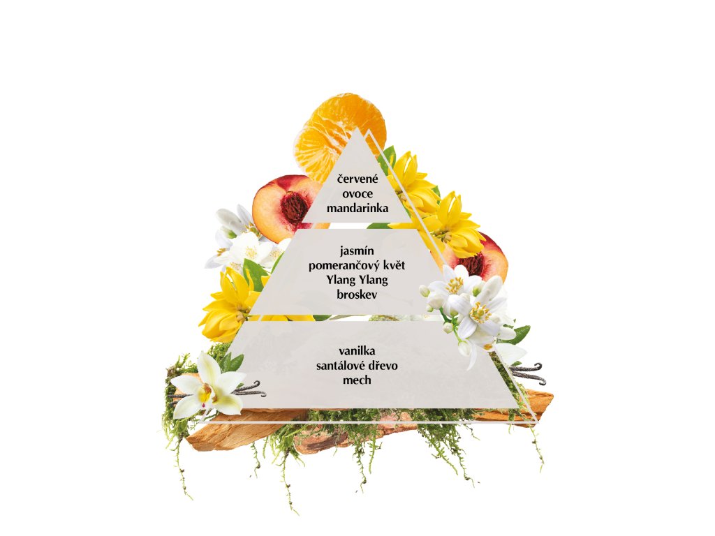Základ tvoří tóny vanilky, santalového dřeva a pižma. Jiskřivé citrusové tóny mandarinky dodávají vůni impuls. Mísí se s jemností jasmínu a pomerančového květu. A vůně broskve zahalí kadeře do hebkosti.